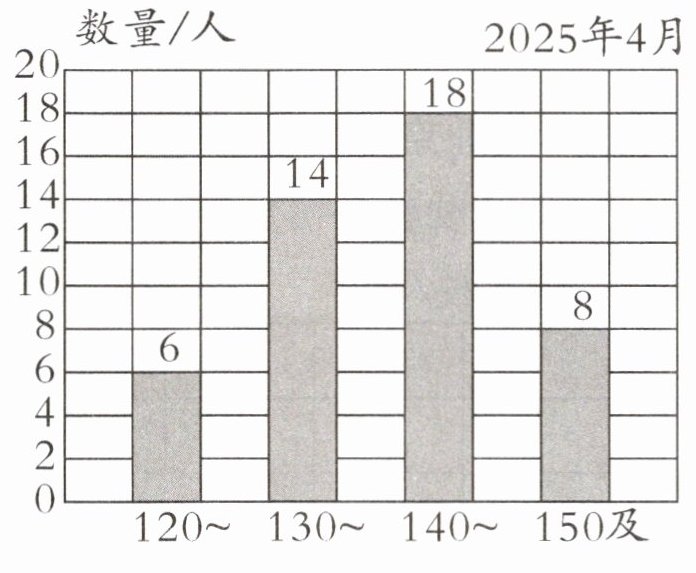 (纵轴:数量/人,刻度0,2,4,6,8,10,12,14,16,18,20;横轴:120~129、130~139、140~149、150及以上;右上角:2025年4月;120~129对应6,130~139对应14,140~149对应18,150及以上对应8,均有灰色直条及数据标注)