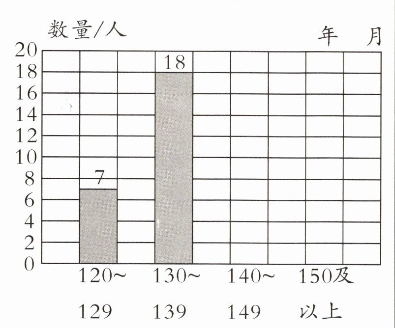 (纵轴:数量/人,刻度0,2,4,6,8,10,12,14,16,18,20;横轴:120~129、130~139、140~149、150及以上;右上角:年 月;120~129对应7,130~139对应18,均有灰色直条及数据标注)