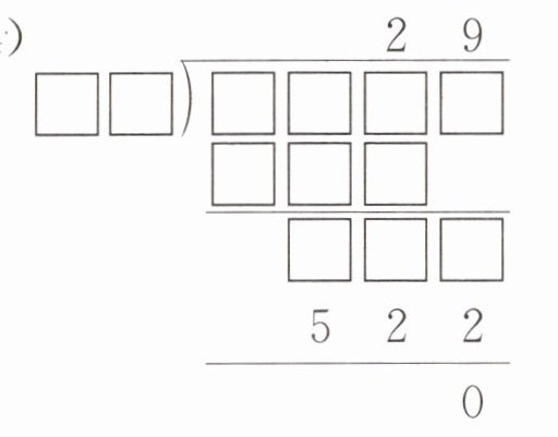 (4)$\begin{array}{r} 2\ 9\\ \Box\Box\enclose{longdiv}{\Box\Box\Box\Box}\\ \Box\Box\Box\quad\\ \hline \Box\Box\Box\quad\\ 5\ 2\ 2\quad\\ \hline 0\quad\end{array}\quad $