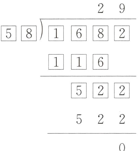 【提示】由竖式可知,商个位上的9与除数的积是522,用522除以9即可求出除数是522÷9=58,从而推算出被除数是58×29=1682。