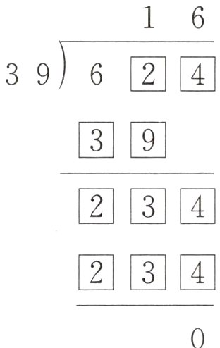 【提示】因为余数是0,所以被除数是39×16=624,其他数字按竖式计算的顺序填写即可。
