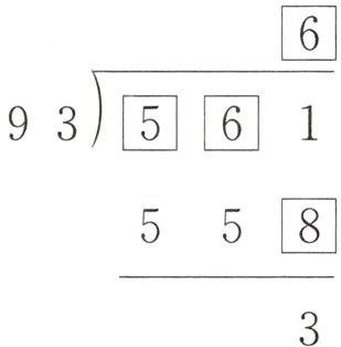 【提示】因为余数是3,所以除数乘商的积的个位上是8,商是558÷93=6,被除数是558+3=561。