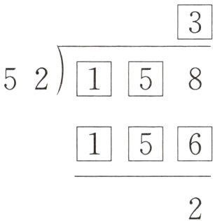 【提示】因为余数是2,所以除数乘商的积的个位上是6,商可能是3或8。若商是3,则除数乘商是52×3=156,被除数是156+2=158;若商是8,则除数乘商是52×8=416,被除数是416+2=418。