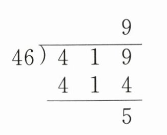 $\begin{array}{r} 9\\ 46\enclose{longdiv} {419}\\ 414\\ \hline 5\end{array} $