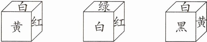 2. 有一个正方体积木的六个面上分别涂上了白、蓝、黄、红、绿、黑六种颜色,下面这三幅图是从三个不同的方向看这个正方体得到的。这个正方体上,黄色的对面是( )色,白色的对面是( )色,红色的对面是( )色。