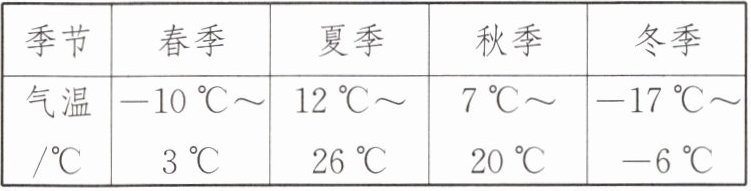 |气温/$^{\circ}C$|$-10^{\circ}C\sim3^{\circ}C$|$12^{\circ}C\sim26^{\circ}C$|$7^{\circ}C\sim20^{\circ}C$|$-17^{\circ}C\sim-6^{\circ}C$|