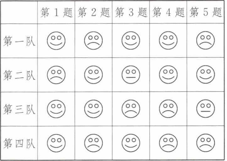 14. 某班举行知识竞赛,评分标准是:答对一题加10分,答错一题扣10分,不回答得0分.每个队的基本分均为0分,四个代表队答题情况如下表:(☺表示答对,☹表示答错,😐表示不答)