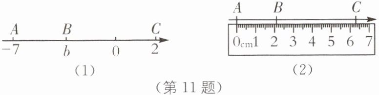 11. 中考新考法 操作探究 (2024·湖南株洲期末)如图(1),点 A,B,C 是数轴上从左到右排列的三个点,分别对应的数为-7,b,2. 某同学将刻度尺按如图(2)所示的方式放置,使刻度尺上的数字 0 对齐数轴上的点 A,发现点 B 对齐刻度 2.1 cm,点 C 对齐刻度 6.3 cm.