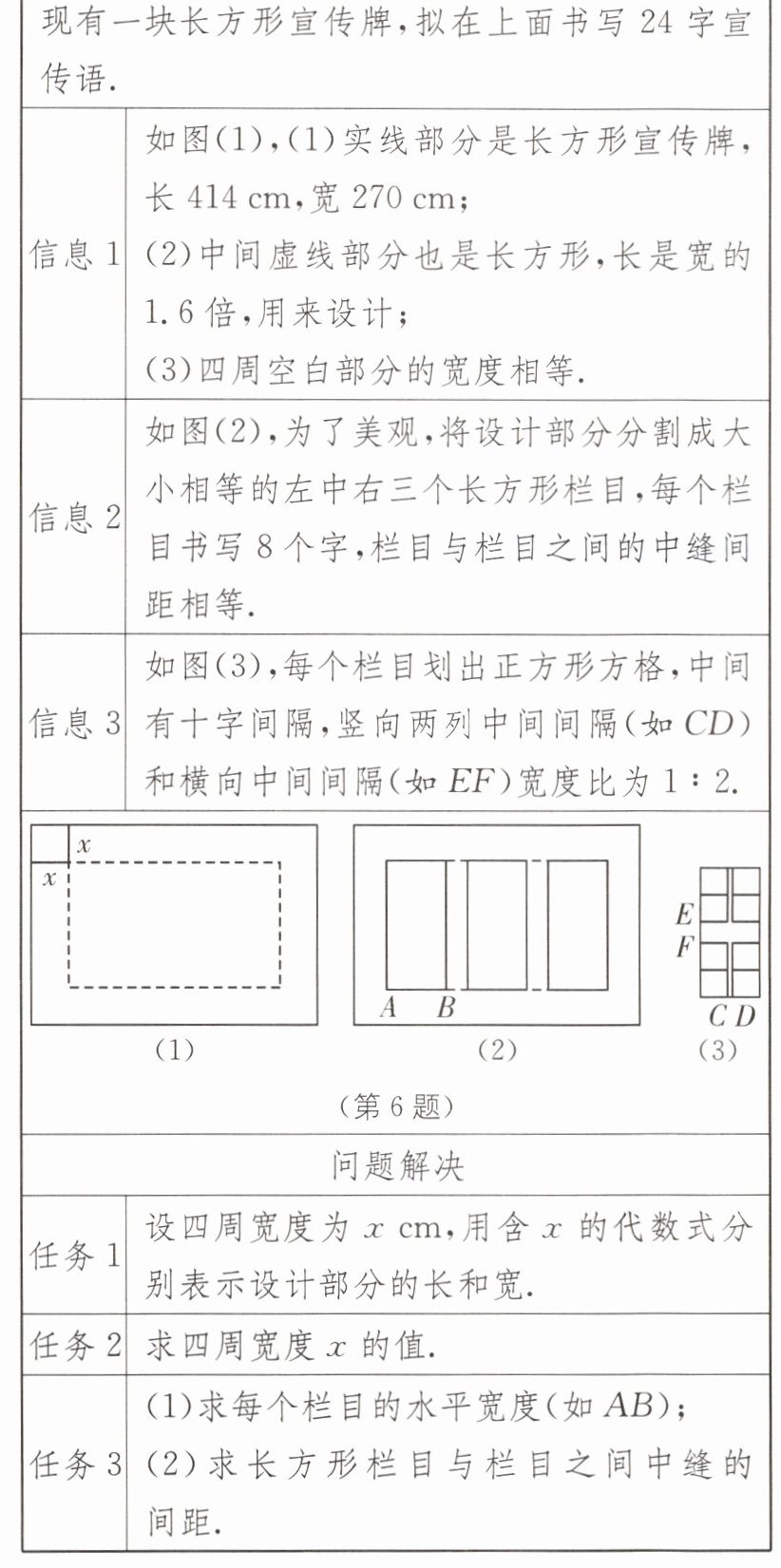 |信息2|如图(2),为了美观,将设计部分割成大小相等的左中右三个长方形栏目,每个栏目书写 8 个字,栏目与栏目之间的中缝间距相等.|
