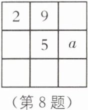8. 传统文化 幻方 (2024·攀枝花中考)幻方,中国古代称为"河图""洛书",又叫"纵横图".如图所示的幻方中,每一行、每一列及各条对角线上的三个数之和均相等,则 a 的值为