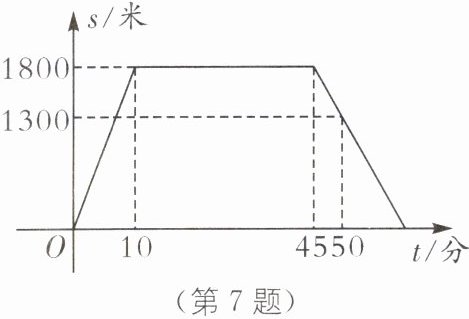 7.C [解析]从小聪家到超市的路程是1800米,小聪从家到超市的平均速度为180米/分,小聪在超市购物用时45-10=35(分钟),小聪从超市返回家中的平均速度为$\frac{1800-1300}{50-45}$=100(米/分).故选C.