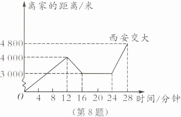 8. 为了体验大学校园文化,小华周末骑电动车从家出发去西安交大,当他骑了一段路时,想起要帮在交大读书的小浩买一本书,于是原路返回到刚经过的书店,买到书后继续前往交大,如图是他离家的距离与时间的关系示意图,请根据图中提供的信息解答下列问题: