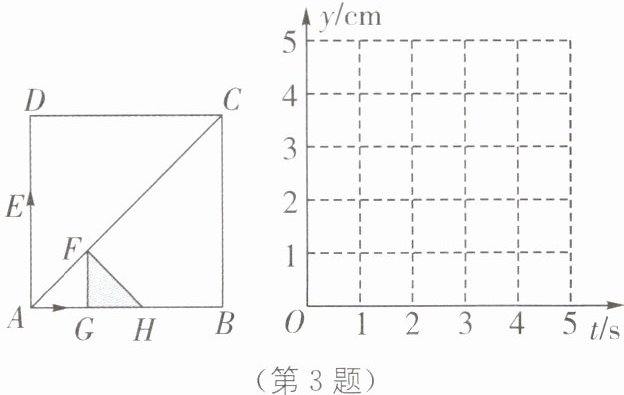 3. 如图,正方形 ABCD 的边长为 4,动点 E 从点 A 出发,以每秒 2 个单位的速度沿 A→D→A 运动,动点 G 从点 A 出发,以每秒 1 个单位的速度沿 A→B 运动,当有一个点到达终点时,另一点随之也停止运动.过点 G 作 FG⊥AB 交 AC 于点 F.设运动时间为 t(单位:秒).以 FG 为一直角边向右作等腰直角三角形 FGH,△FGH 与正方形 ABCD 重叠部分的面积为 S.