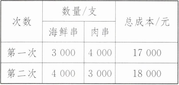 7. (2023·襄阳中考)在襄阳市创建“经济品牌特色品牌”政策的影响下.每到傍晚,市内某网红烧烤店就食客如云,这家烧烤店的海鲜串和肉串非常畅销,店主从食品加工厂批发以上两种产品进行加工销售,其中海鲜串的成本为 m 元/支,肉串的成本为 n 元/支;两次购进并加工海鲜串和肉串的数量与成本如下表所示(成本包括进价和其他费用):