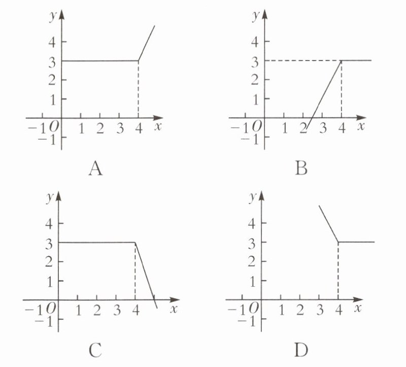 8. 中考新考法 新定义问题 若定义一种新运算:$ a\otimes b= \left\{\begin{array}{l} a-b(a\geq 2b),\\ a+b-6(a<2b).\end{array} \right. $ 例如:$ 3\otimes 1= 3-1= 2 $;$ 5\otimes 4= 5+4-6= 3 $,则函数 $ y= (x+2)\otimes (x-1) $ 的图象大致是(