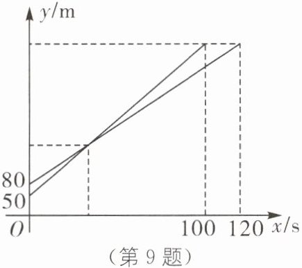 9. (2023·大连中考)某学校体育队开展跑步训练,体育老师将队员分成男、女两组. 两组队员从同一地点同向先后出发,女子组跑了 80 m 时,男子组恰好跑了 50 m. 此后两组队员开始匀速跑,直到终点. 已知男子组匀速跑的速度为 4.5 m/s. 男、女两组队员跑步的路程 y(单位:m)与匀速跑的时间 x(单位:s)的图象如图所示.