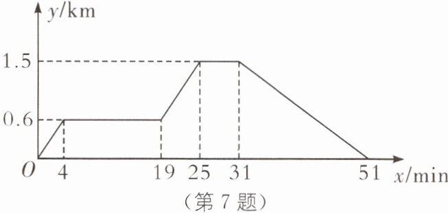 7. 一题多问 (2024·天津中考)已知小华的家、画社、文化广场依次在同一条直线上,画社离家 0.6 km,文化广场离家 1.5 km. 小华从家出发,先匀速骑行了 4 min 到画社,在画社停留了 15 min,之后匀速骑行了 6 min 到文化广场,在文化广场停留 6 min 后,再匀速步行了 20 min 返回家. 如图,图中 x 表示时间,y 表示离家的距离. 图象反映了这个过程中小华离家的距离与时间之间的对应关系.