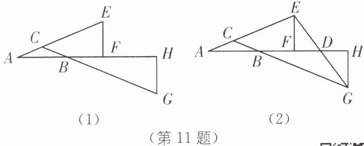 11. (2024·扬州仪征期中)如图(1),在△ABC 中,∠A= ∠ABC,延长 AC 到 E,过点 E 作 EF⊥AB 交 AB 的延长线于点 F,延长 CB 到 G,过点 G 作 GH⊥AB 交 AB 的延长线于点 H,且 EF= GH.