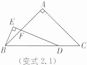 变式2.1 如图,在$\triangle ABC$中,$AB= AC$,$\angle BAC= 90^{\circ}$,点$D在线段BC$上,$\angle EDB= \frac{1}{2}\angle C$,$BE \perp DE$,垂足为$E$,$DE与AB相交于点F$,试探究线段$BE与FD$的数量关系,并证明你的结论.