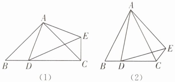 (1)如图(1),当点D在线段CB上,且∠BAC= 90°时,那么∠DCE= ______度;