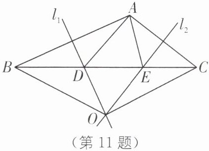 11. 如图,在△ABC 中,边 AB 的垂直平分线$ l_1 $交 BC 于点 D,边 AC 的垂直平分线$ l_2 $交 BC 于点$ E,l_1 $与$ l_2 $相交于点 O,连接 OB,OC. 若△ADE 的周长为 12 cm,△OBC 的周长为 32 cm.