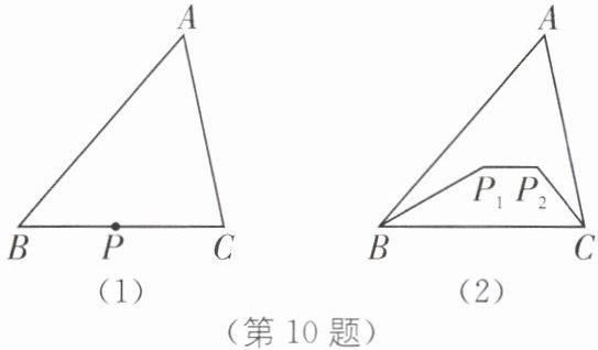 (2)四边形BP₁P₂C的周长<△ABC的周长.理由如下:如图,分别延长BP₁,CP₂交于点M,易知,BM+CM<AB+AC.又P₁P₂<P₁M+P₂M,所以BP₁+P₁P₂+P₂C<BM+CM<AB+AC,所以四边形BP₁P₂C的周长<△ABC的周长.