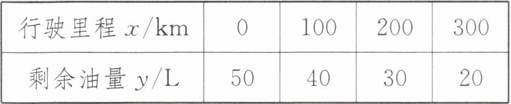 ∴y与x成一次函数关系.设油箱中剩余油量y(单位:L)关于行驶里程x(单位:km)的函数表达式为y=kx+b,将(0,50),(100,40)代入y=kx+b,得$\begin{cases} b=50, \\ 100k+b=40, \end{cases}$解得$\begin{cases} k=-0.1, \\ b=50, \end{cases}$
