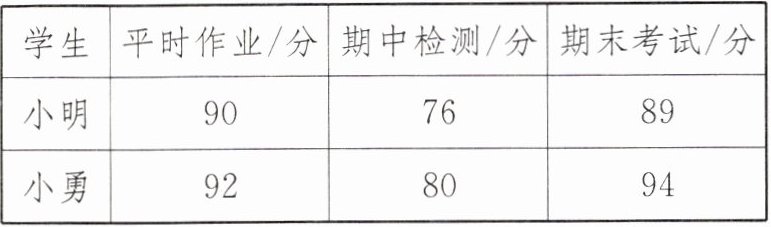 7.(2025·扬州高邮期中)某校学期综合评价成绩是由平时作业、期中检测、期末考试三项成绩构成的,若学期综合评价成绩在90分以上,则评为“优秀”.下表是小明和小勇两位同学某学科的成绩.