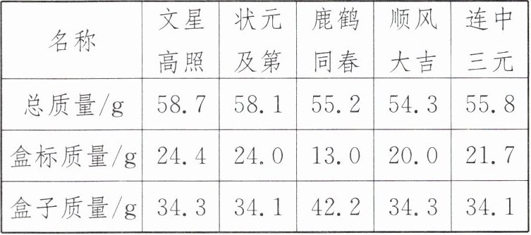 (2)“鹿鹤同春”密封盒的质量异常,故“鹿鹤同春”的质量与实际质量差异较大,其余四个盒子的质量的平均数为$\frac{34.3 + 34.1 + 34.3 + 34.1}{4}=34.2(g)$,55.2 - 34.2 = 21.0(g).故“鹿鹤同春”的实际质量约为 21.0 克.