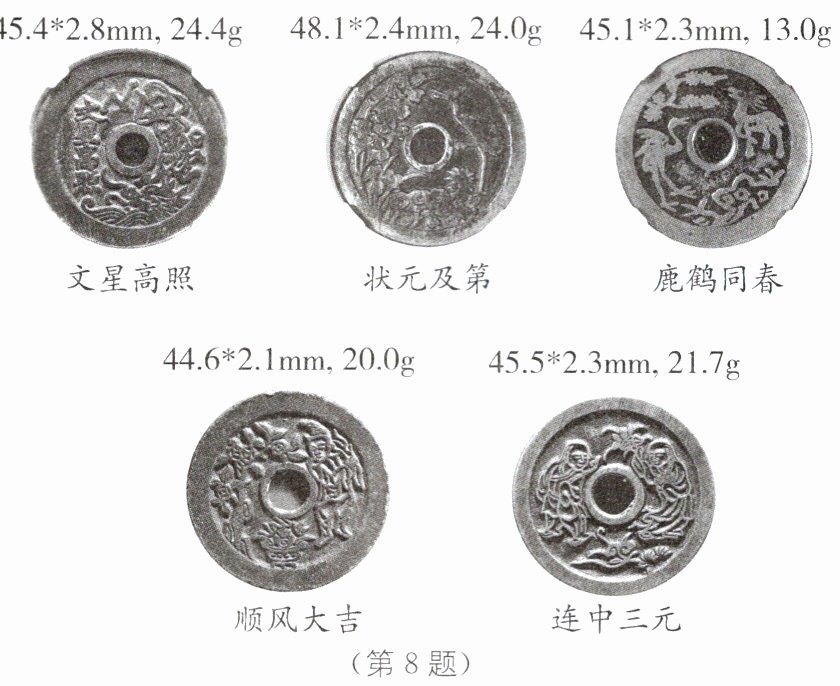 8. 传统文化 古钱币 如图,下列装在相同的透明密封盒内的古钱币,其密封盒上分别标有古钱币的尺寸及质量,例如:钱币"文星高照"密封盒上所标"45.4*2.8 mm,24.4g"是指该枚古钱币的直径为 45.4 mm,厚度为 2.8 mm,质量为 24.4 g. 已知这些古钱币的材质相同.