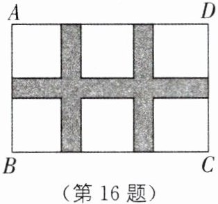 16.教材P6思考与探索·变式 如图,某小区规划在一个长为40m、宽为26m的矩形场地ABCD上修建三条同样宽的甬路,使其中两条与AB平行,另一条与AD平行,其余部分种草.若使每一块草坪的面积都为$144m^2,$求甬路的宽度.(根据题意列出方程即可)