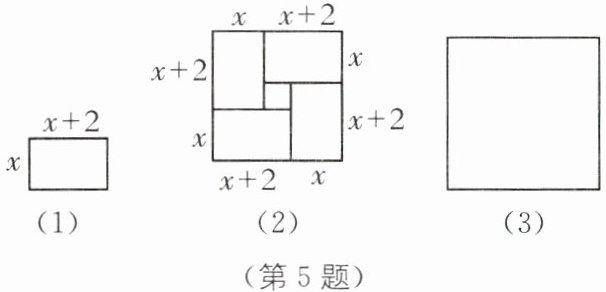 5.(2025·山东济南章丘四中期中)[问题发现]我国数学家赵爽在其所著的《勾股圆方图注》中记载了一元二次方程的几何解法.例如$x^{2}+2x-35= 0$,可变形为$x(x+2)= 35$.如图(1),构造一个长为$x+2$、宽为x、面积为 35 的矩形;如图(2),将 4 个矩形构造成一个边长为$(x+x+2)$的大正方形,中间恰好是一个边长为2 的小正方形.大正方形的面积可表示为$(x+x+2)^{2}$,也可表示为$4×35+2^{2}$,由此可得新方程:$(x+x+2)^{2}= 144$,易得这个方程的正数解为$x= 5$.注意:这种构造图形的方法只能求出方程的一个根!