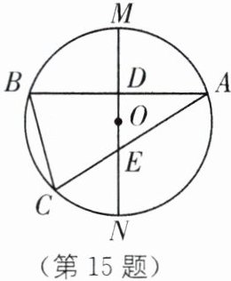 15. (2025·金华东阳期中改编)如图,已知△ABC 内接于⊙O,直径 MN⊥AB 于点 D,交 AC 于点 E,且 MD= DE. 若 MN= 3NE,且 AB= $4\sqrt{6}$,求 AE 的长.