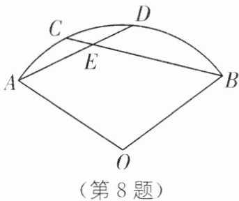 8. 教材P55例1·变式 如图,在扇形OAB中,已知点C、D在$\overset{\frown}{AB}$上,连接AD、BC交于点E,若$\angle AOB= 110^{\circ }$,$\overset{\frown}{CD}的度数为40^{\circ }$,则$\angle DEB= $______${}^{\circ }$.