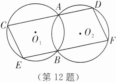 12. 如图,已知两个等圆$\odot O_{1}和\odot O_{2}$相交于 A、B 两点,经过点 A 的直线与两圆分别交于点 C、D,经过点 B 的直线与两圆分别交于点 E、F,且$CD// EF$. 求证: