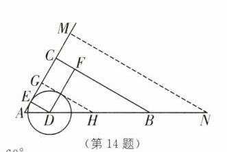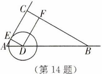 14.(2024·镇江期中)在$Rt\triangle ABC$中,$∠ACB= 90^{\circ },∠A= 60^{\circ },AB= 10cm$,点 D 从点 A 出发,沿射线 AB 以 2 cm/s 的速度移动,移动过程中始终保持$DE// BC,DF// AC$(点 E、F 分别在射线 AC、CB 上).以点 D 为圆心,DE 为半径作$\odot D$,若$\odot D$上恰好只有两个点到直线 BC 的距离为 3 cm,设点 D 移动的时间为 t 秒,则 t 的取值范围是______.