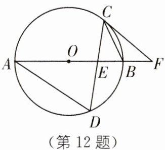 12. 如图,在$\odot O$中,直径 AB 与弦 CD 相交于点 E,连接 BC、AD,过点 C 的切线与 AB 的延长线交于点 F,若$∠D= 65^{\circ }$,则$∠F$的度数等于(