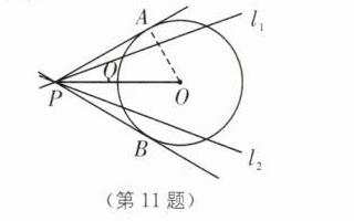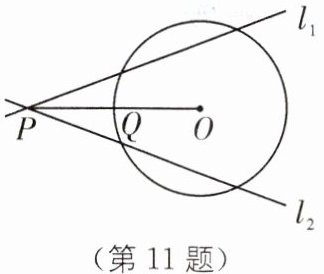 11. 如图,点 P 为$\odot O$外一点,连接 OP 交$\odot O$于点 Q,且$PQ= OQ$,经过点 P 的直线$l_{1}$、$l_{2}都与\odot O$有公共点,则$l_{1}与l_{2}$所成的锐角α的取值范围是( ).