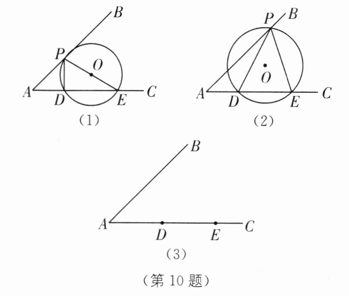 已知∠A= 45°,点D、E在AC上,DE= 10,点P在AB上,连接PD、PE,作△PDE的外接圆⊙O.