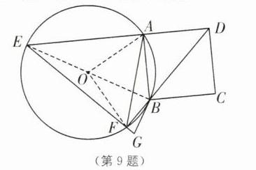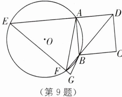 9. 如图,四边形ABCD是正方形,点A、点B在⊙O上,边DA的延长线交⊙O于点E,对角线DB的延长线交⊙O于点F,连接EF并延长至点G,使∠FBG= ∠FAB.