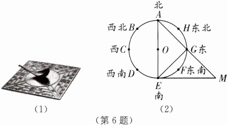 6. 传统文化 司南 (2025·扬州广陵区期中)司南是我国古代辨别方向用的一种仪器.其早在战国时期就已被发明,是现在所用指南针的始祖.如图(2),司南中心为一圆形,圆心为点O,直径为20,根据八个方位将圆形八等分(图(2)中点A~H),过点E作⊙O的切线与AG的延长线交于点M,连接EG.