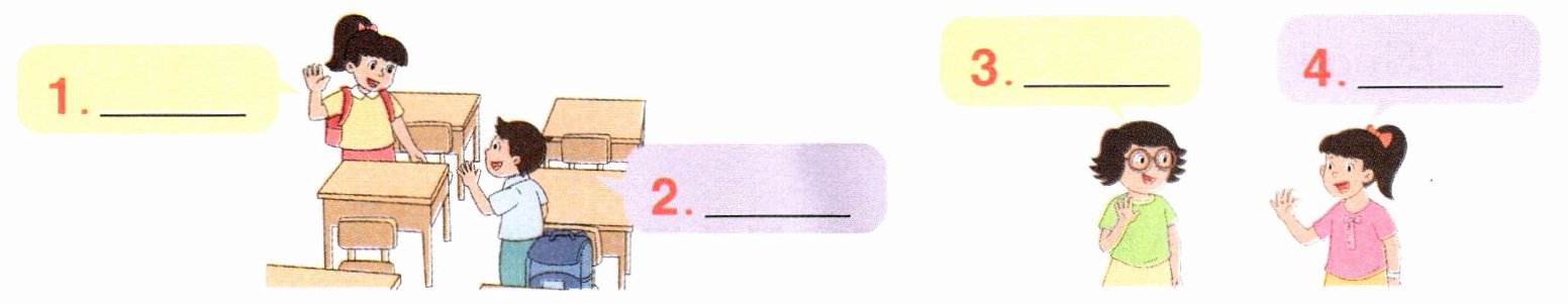 四、请你仔细观察图片,猜猜他们是怎么互相打招呼的?选择合适的句子,完成对话。