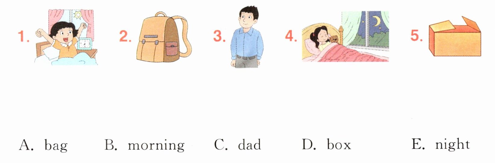 1—B 2—A 3—C 4—E 5—D 1. 图为女孩早上起床的情景。故选 B。2. 图为包。故选 A。3. 图为爸爸。故选 C。4. 图为女孩夜间睡觉的情景。故选 E。5. 图为盒子。故选 D。