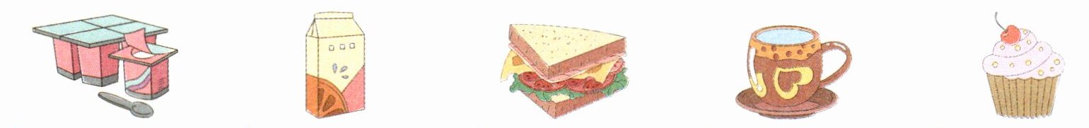 1. juice 2. sandwich 3. tarts 4. yogurt 5. cupcake 1. 图片为果汁,英文为“juice”。故选 juice。2. 图片为一个三明治,sandwich 用单数。故选 sandwich。3. 图片为两个蛋挞,tart 用复数。故选 tarts。4. 图片为酸奶,英文为“yogurt”。故选 yogurt。5. 图片为一个纸杯蛋糕,cupcake 用单数。故选 cupcake。