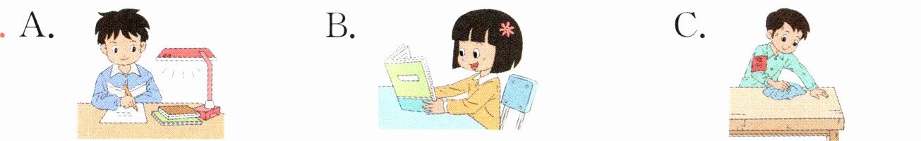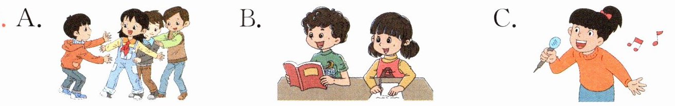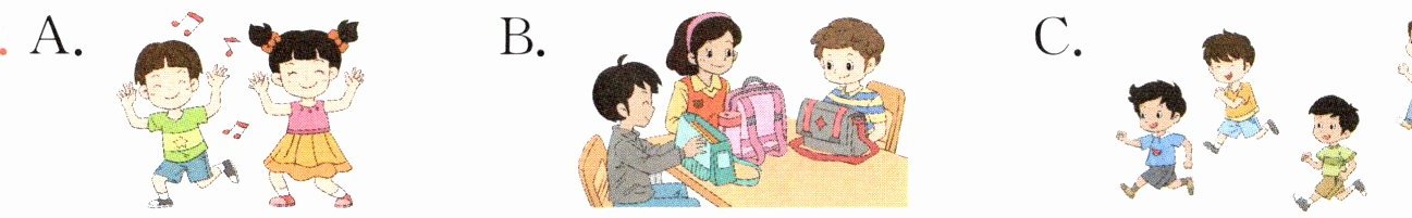 1. ③ 2. ② 3. ④ 4. ① 1. 图片是孩子们做游戏,与 play games 相对应。2. 图片是女孩读书,与 read 相对应。3. 图片是孩子们跳舞,与 dance 相对应。4. 图片是女孩上学,与 school 相对应。