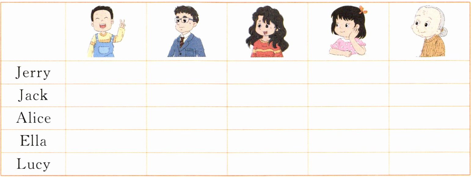 这是一道英语听力题目,考查学生对所听内容的理解和记录能力,需要根据录音内容在表格相应位置打“√”。由于没有提供录音内容,无法给出具体的打“√”位置,但答题格式是先听录音,然后根据录音中提到的人物相关信息,在对应人物下方的表格相应列打“√”。