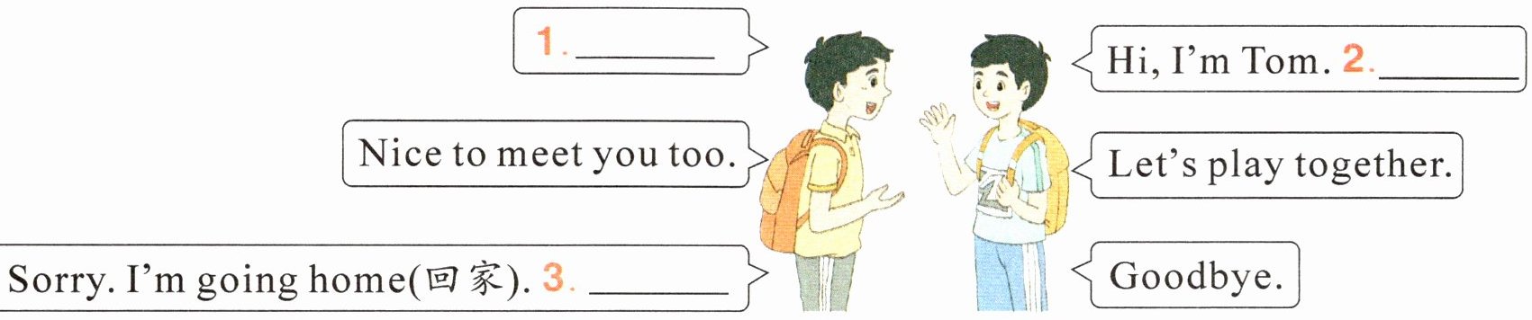 三、新情境 亲子活动 Joe 去参加一个社区举办的亲子活动。在活动现场,他遇见了同样来参加活动的 Tom。看图,完成下列各题。