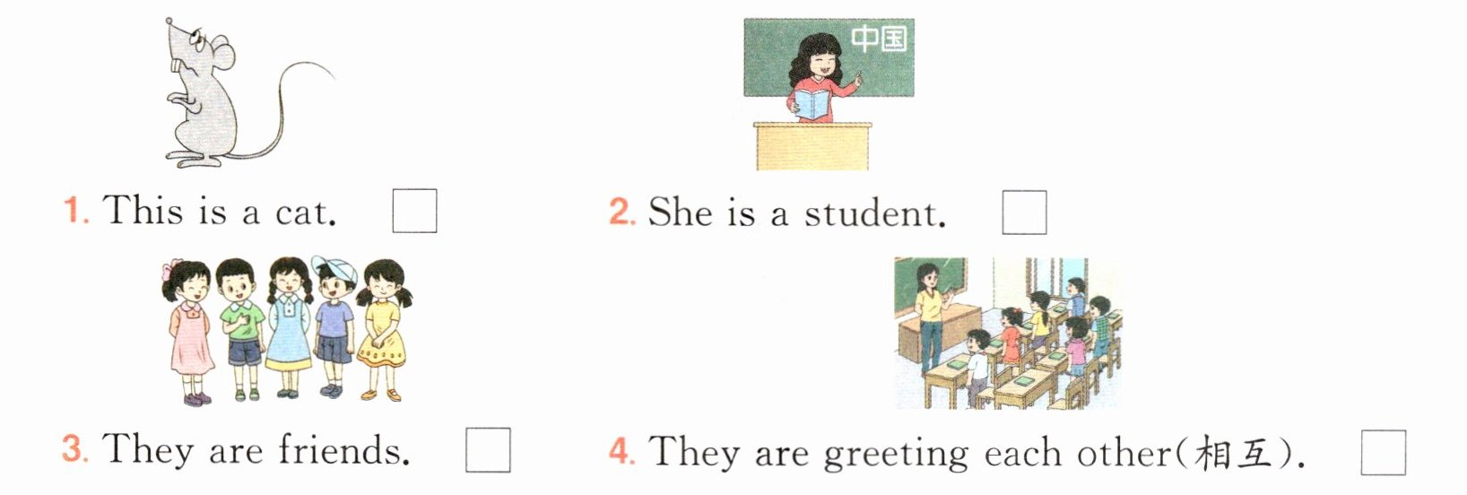二、Look and read. Put a tick(√) or a cross(×) in the box. 看一看,读一读。在方框里写出对(√)错(×)。[剑桥少儿英语(Starters 1)改编]