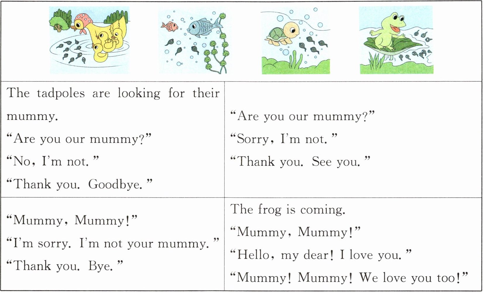 tadpole /'tædpəʊl/ 蝌蚪 look for 寻找 mummy /'mʌmi/ 妈咪