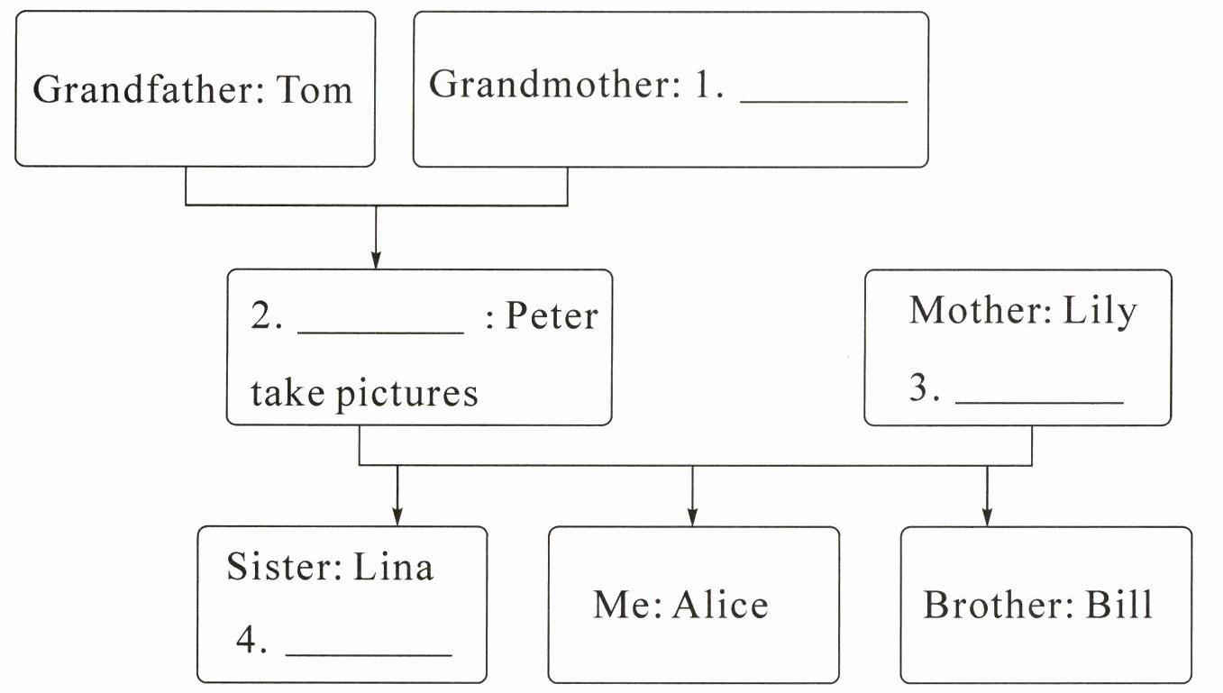 Look, this is my grandfather, Tom. And thisis my grandmother, Lucy. He is my mother Peter. She can sing pictures. She is my sister, Lily. She can sing well. This is my sister, Lina. She can dance beautifully. Who's the baby? It's my brother, Bill.